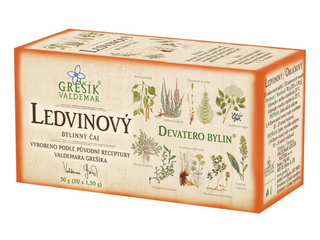 Složení: bříza list, vřes nať, zlatobýl nať, truskavec nať, černý bez květ, brusinka list, libeček kořen, průtržník nať, přeslička nať