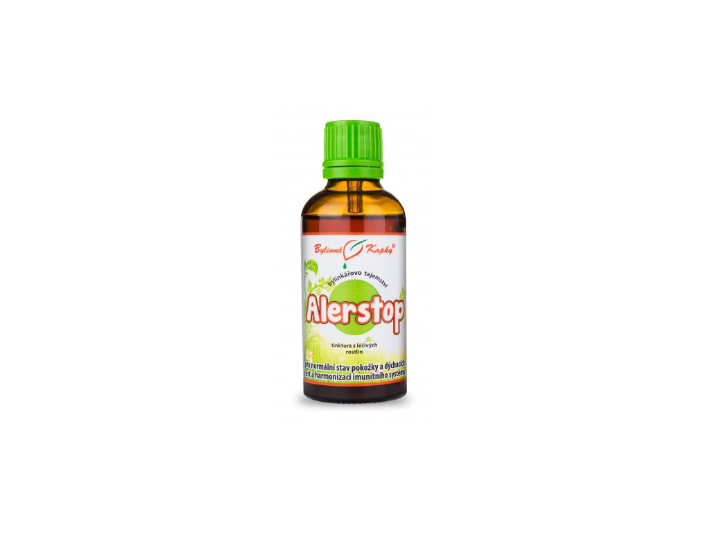 Alerstop (bylinná tinktura - bylinné kapky z řady Bylinkářovo tajemství). Přírodní bylinný celkový (komplexní) extrakt z léčivých rostlin pro správnou produkci cytokinů a specifických protilátek. Pro zlepšení stavu při alergiích.