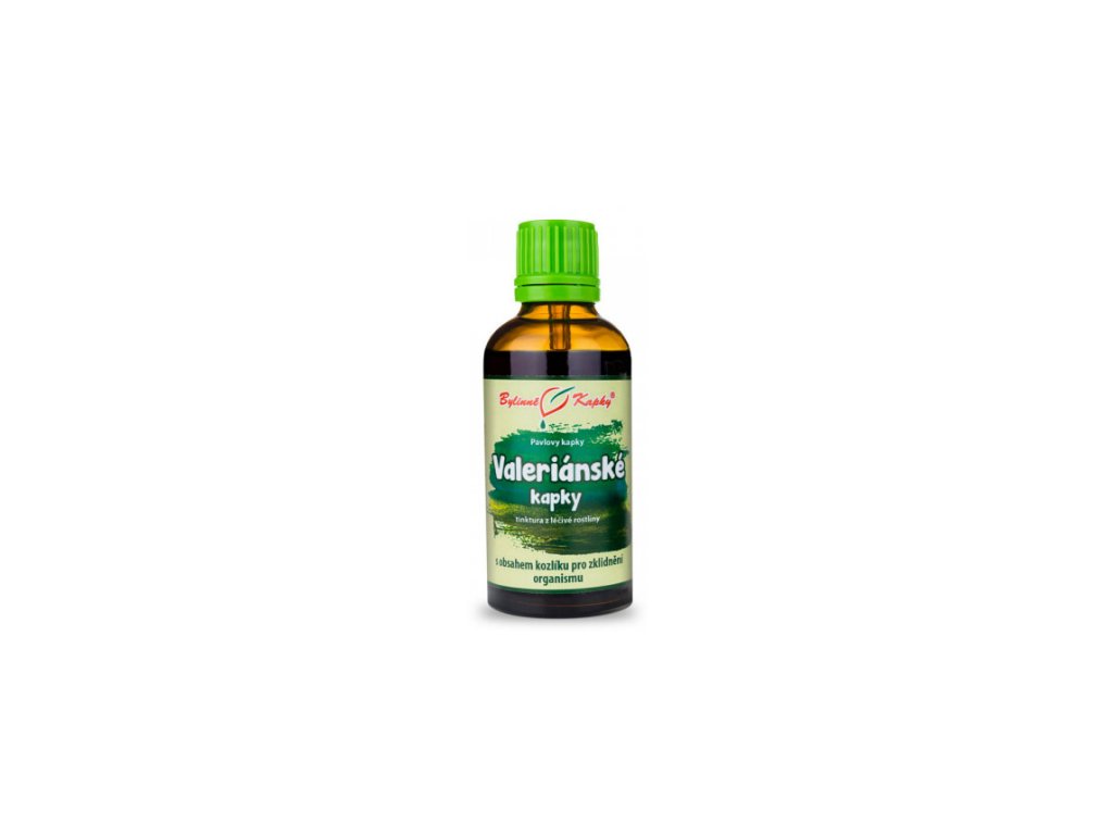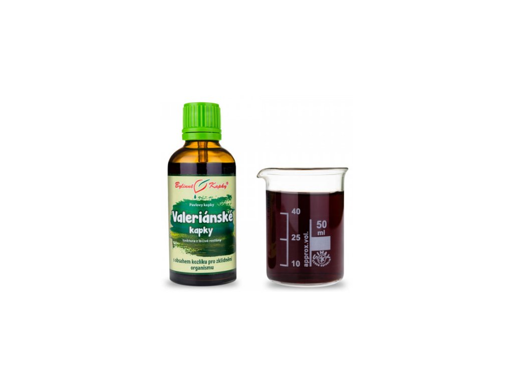 Valeriánské kapky (bylinná tinktura - Pavlovy bylinné kapky). Přírodní bylinný extrakt z léčivé rostliny kozlíku lékařského pro potlačení stresu, pro relaxaci a duševní zdraví. Tinctura Valerianae tinctura. Tincture Valerian tincture.