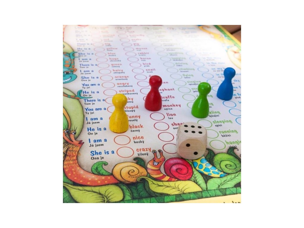 Leporelo stolních her pro zábavné učení PŘÍRODOPISU A ANGLIČTINY s kostkou, figurkami a žetony pro děti od 6 let.