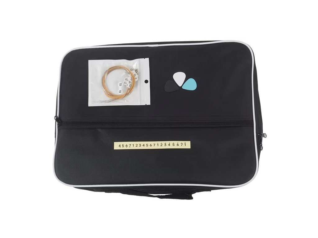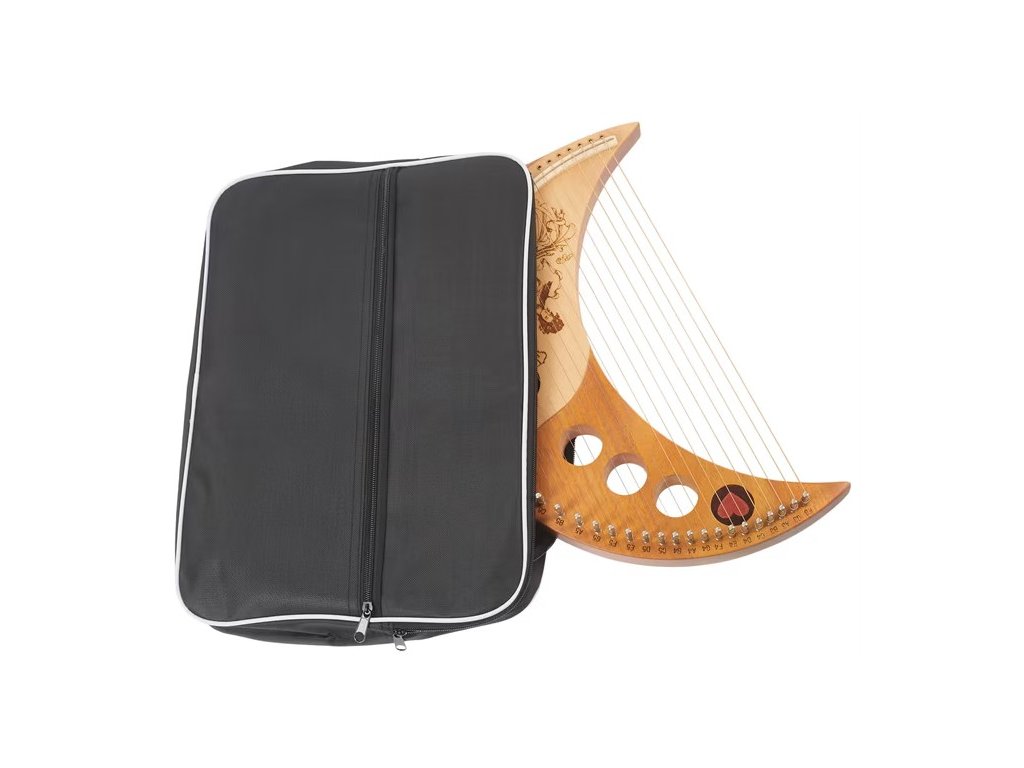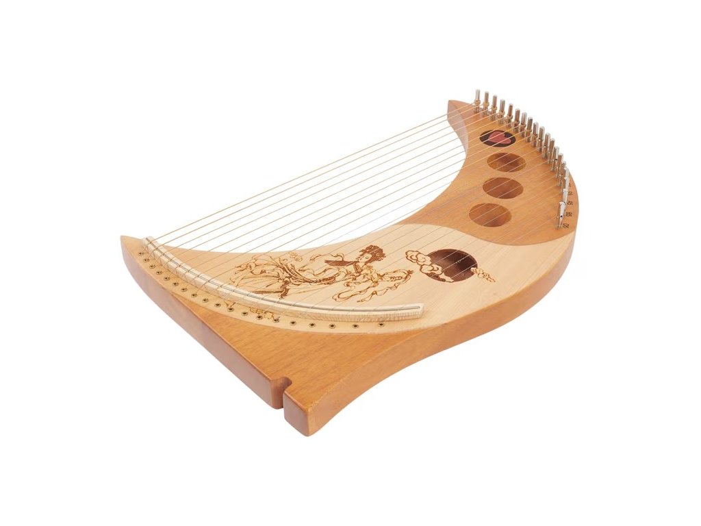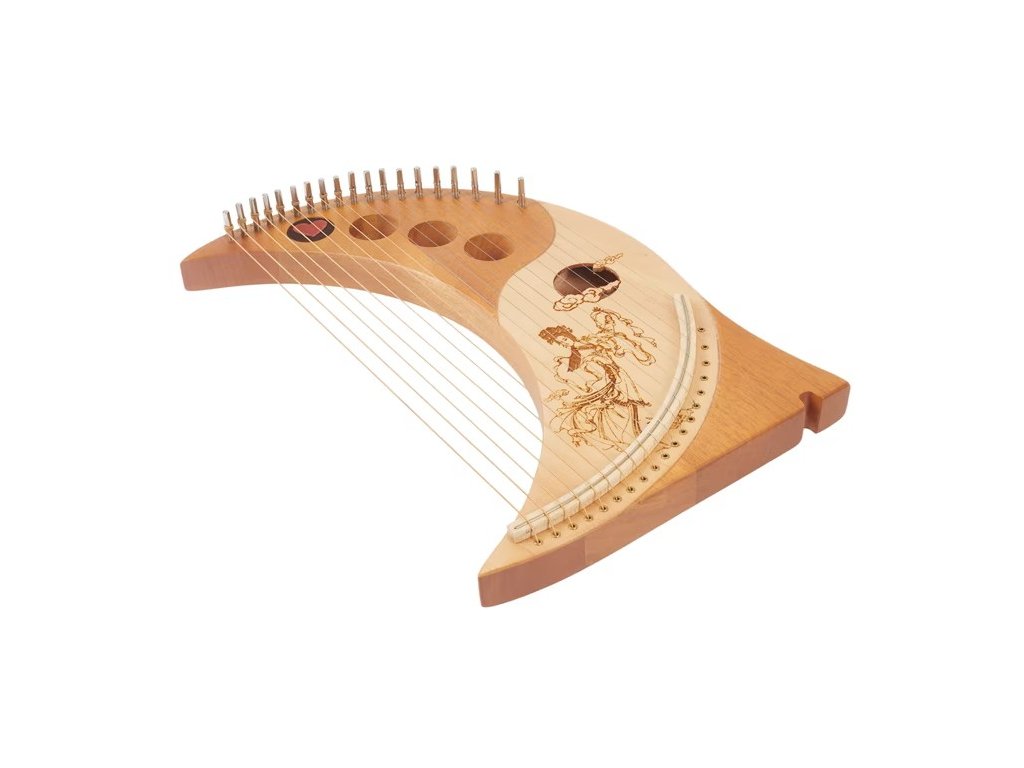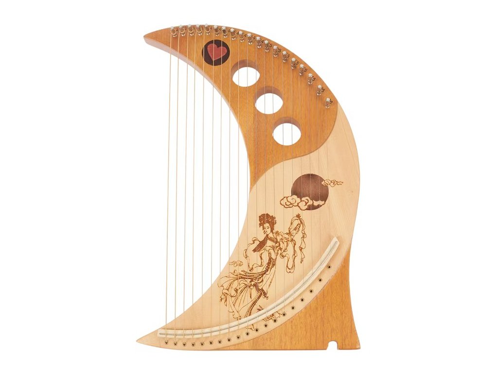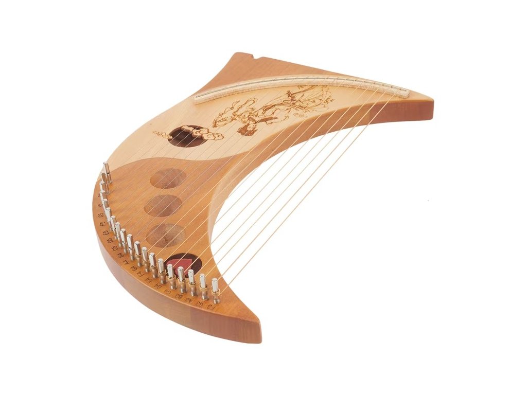 Tato harfa tvarem připomínajícím měsíc je v přírodní barvě, má devatenáct strun a je zdobena řezbou pod ozvučnými otvory.