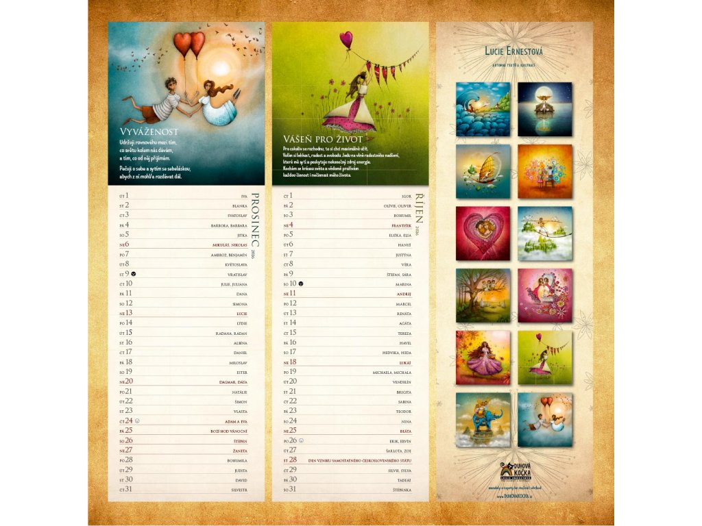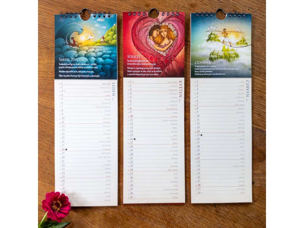Úzký nástěnný kalendář na rok 2026 s ilustracemi z projektů On a ona - partnerské karty, Inspirační karty Cesta životem a Inspirační karty Cesta k sobě.