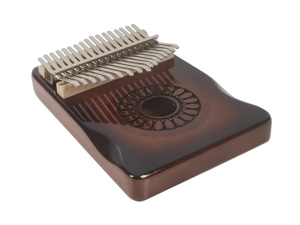 Tato kalimba je vyrobena ze zvučného mahagonu, osázená sedmnácti klávesami z karbonové oceli a laděná v C. Zdobená je řezbou kapek okolo ozvučného otvoru.