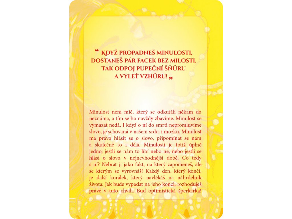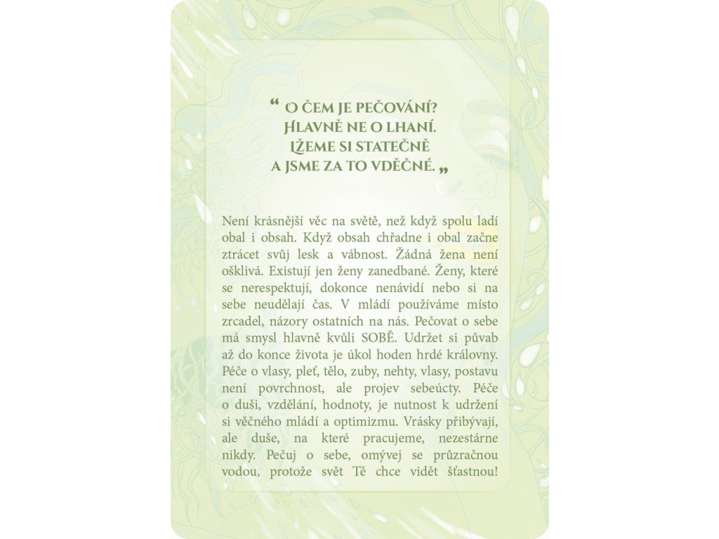 Vykládací karty ženství „ JSI KRÁSNÁ“ Vám mohou ukázat cestu, jak se v sobě lépe vyznat. Pochopit, co je ženskost a co je vnitřní ženství. Ručně ilustrované karty odhalují 68 témat, kterými se dotknete svého skrytého vnitřního života. Karty Vám prozradí vše, co se Vás hluboce dotýká, co s Vámi rezonuje, jaké pocity a emoce jednotlivá témata ve Vás probouzejí. Můžete tak odhalit svou pravou tvář, svou nejhlubší podstatu. Na každé zadní straně karty je její význam vyjádřen básní i vzkazem. Téma pro tu danou chvíli odhaluje Vaše možnosti a ukazuje Vám, jakým směrem se můžete vydat. Poselstvím vykládacích karet ženství „ JSI KRÁSNÁ“ je podpora každé z Vás, abyste věřila a zůstala věrná sama sobě. Zasloužíte si to! Čím dříve budete spojena sama se sebou, tím dříve bude Váš život naplněný láskou, něhou, lehkostí, radostí, kvalitními vztahy, zdravím, sebedůvěrou a štěstím.