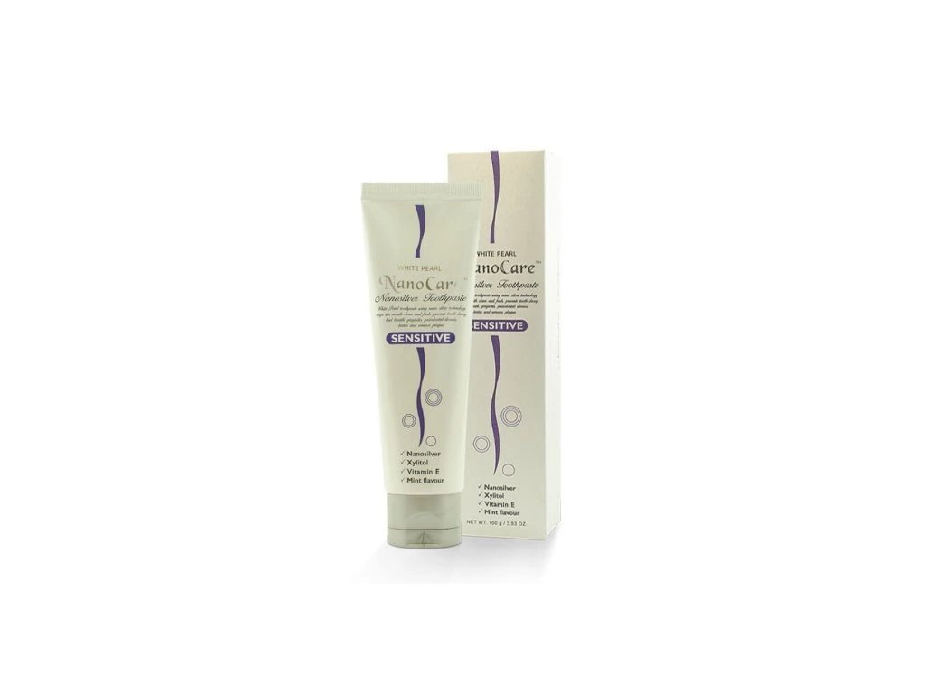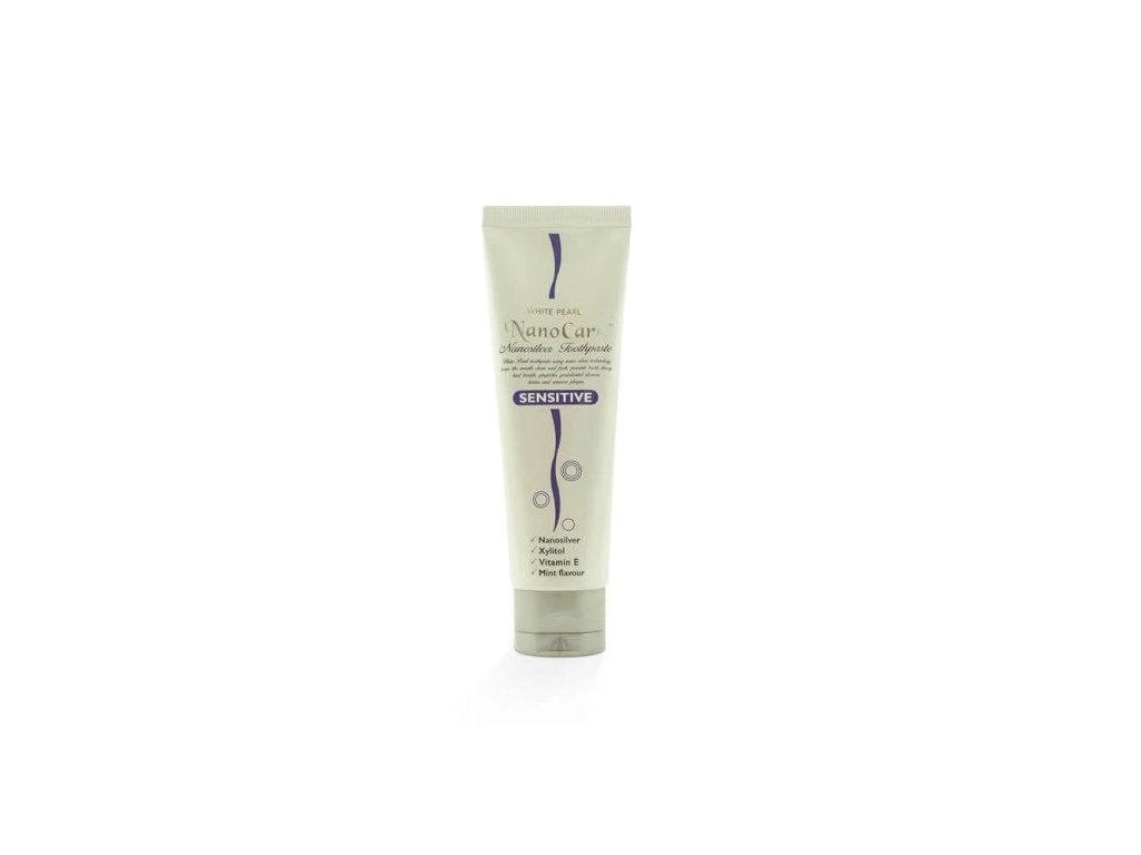 Zubní pasta White Pearl NanoCare Sensitive pro citlivé zuby pomáhá razantně snižovat citlivost zubů a dásní. Obsahuje koloidní stříbro, hydroxyapatit, allantion, vitamin E a mentolový extrakt. Chrání dásně, zubní sklovinu a chrání vaše zuby před zubním kazem. Zubní pasta Sensitive NanoCare od značky White Pearl neobsahuje fluorid a je vhodná pro každodenní použití.