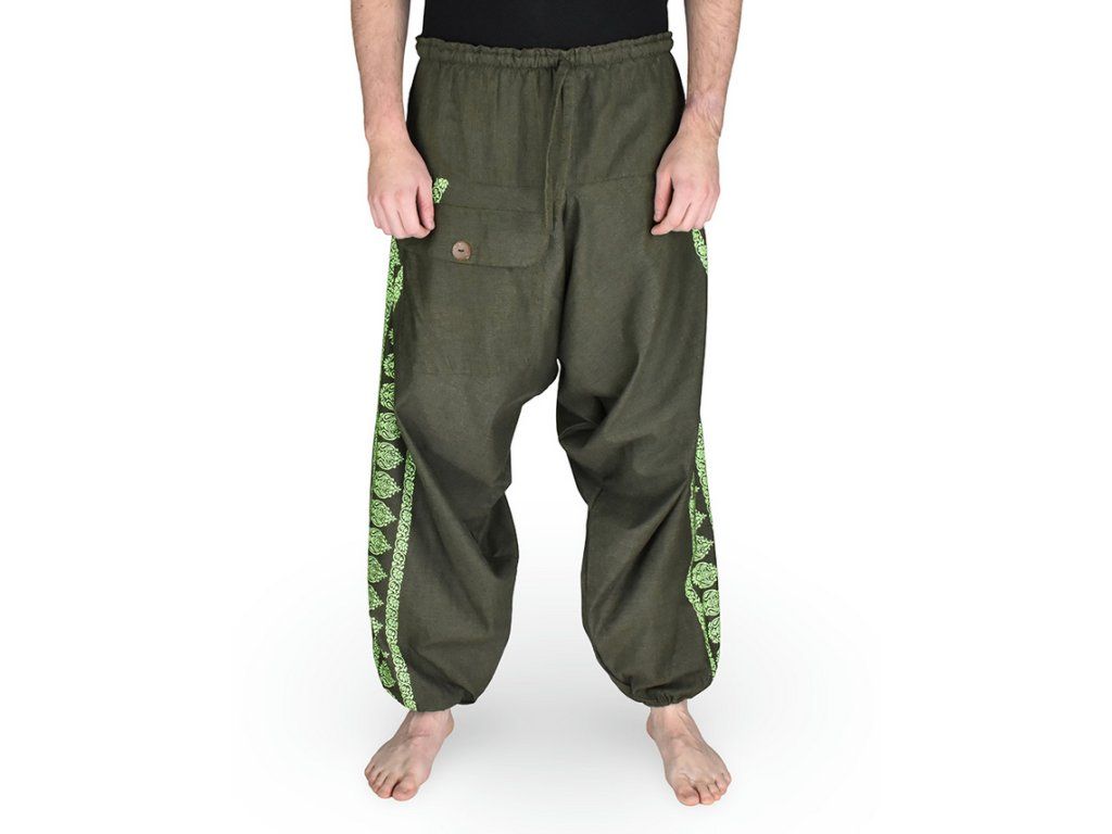 Praktická je jedna přední kapsa s kokosovým falešným knoflíkem, pod kterým je schovaný suchý zip. Boky kalhot zdobí jemný rostlinný motiv s palmetou. Tento ornament je v mnoha kulturách symbolem života, růstu a harmonie s přírodou a dodává kalhotám lehký nádech orientální inspirace.