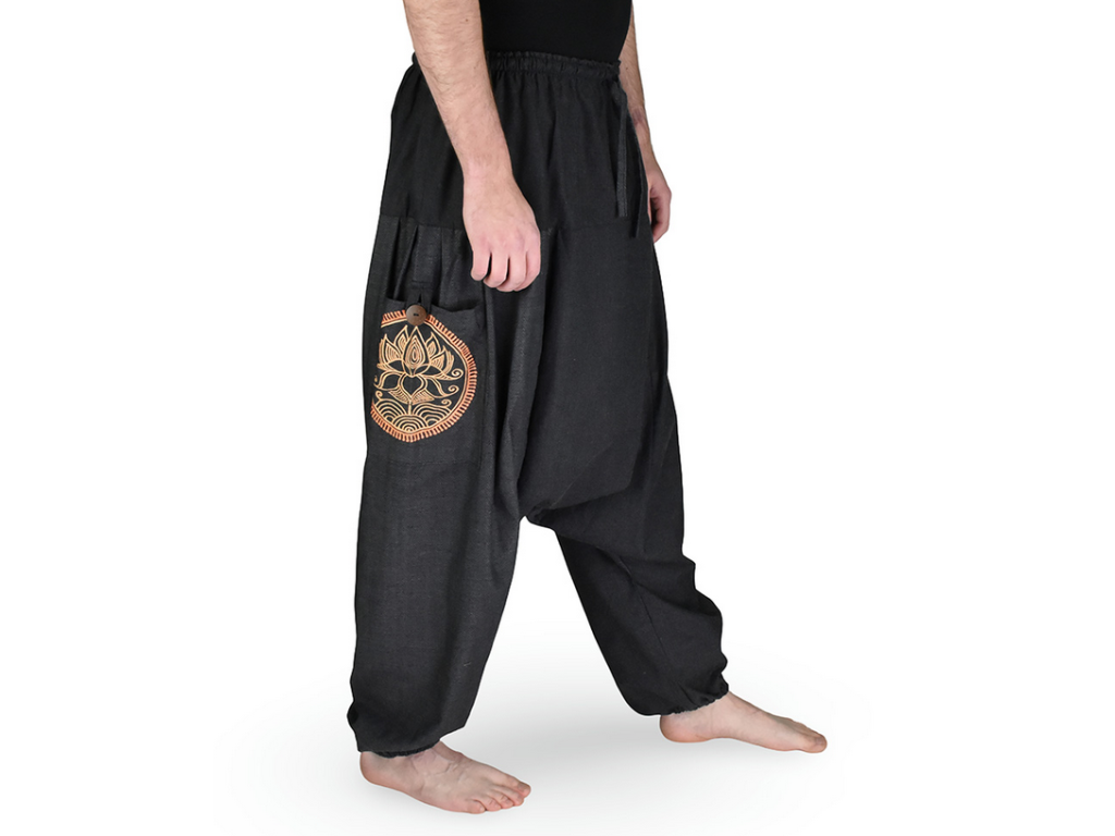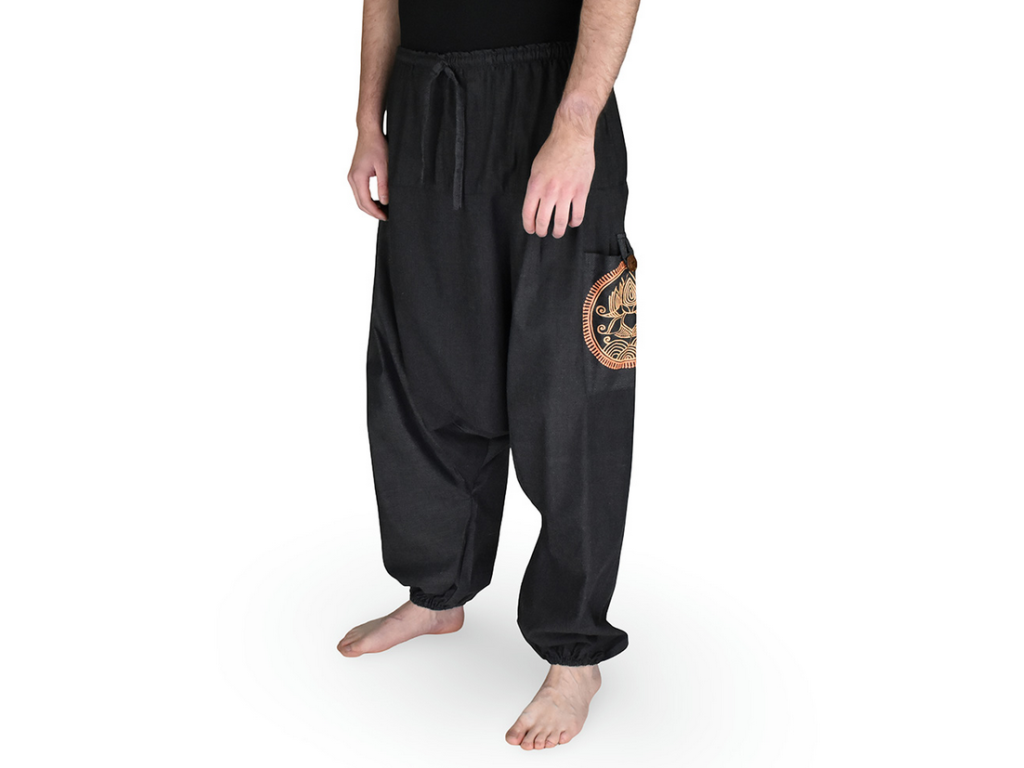 Harémové kalhoty TARA zaujmou pohodlným střihem s nízkým sedem a uvolněným boho vzhledem. Díky pružné gumě se šňůrkou v pase a gumě na koncích nohavic se příjemně přizpůsobí postavě a poskytují maximální komfort při nošení. Kalhoty mají dvě praktické kapsy na knoflík s poutkem, které zdobí jemný, ale výrazný ornament lotosu.