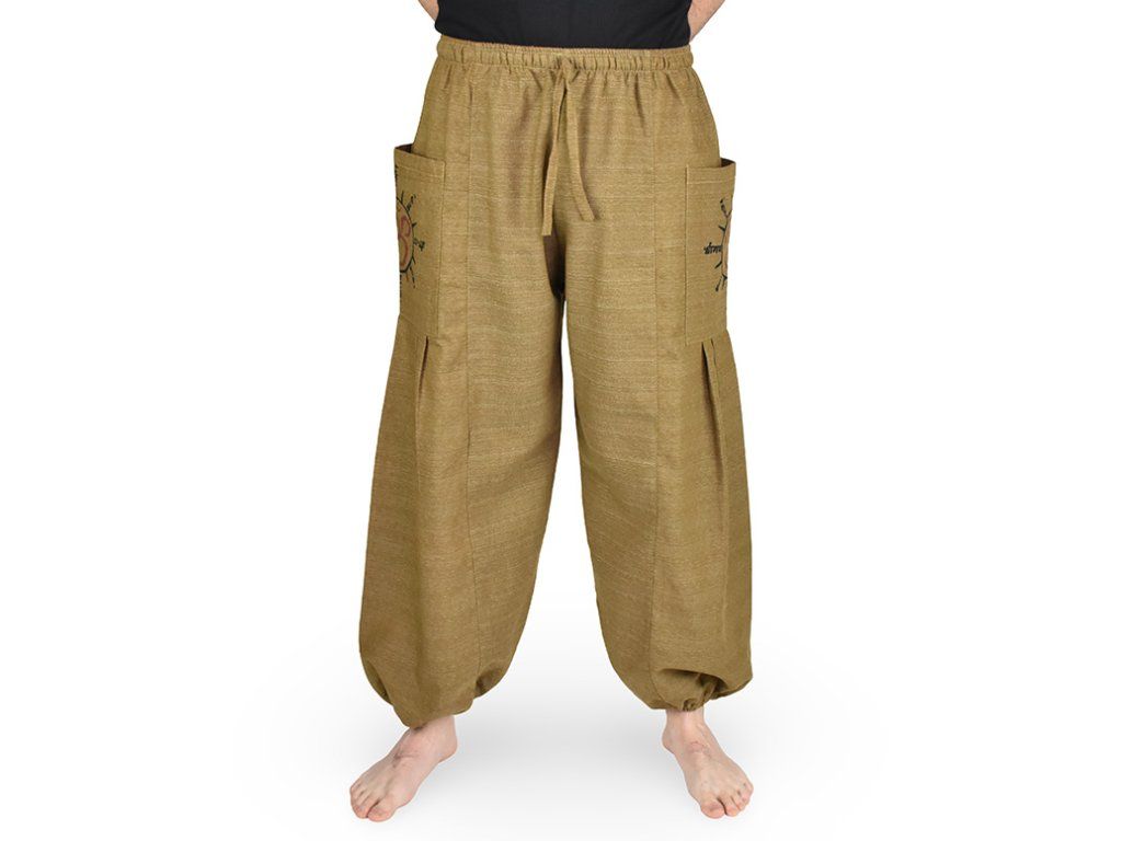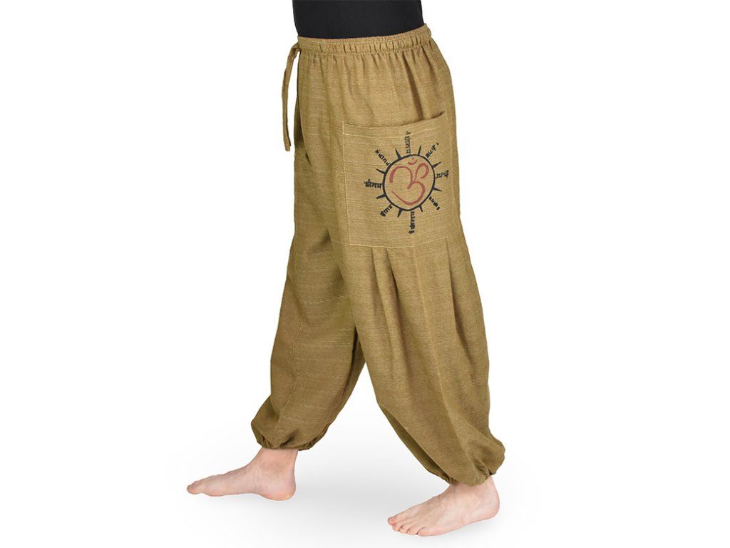 Pohodlné a stylové kalhoty NIRVA v balonovém střihu. Kalhoty mají dvě praktické boční kapsy a potisk Ómu ve slunci, symbolizující energii a světlo. V pase je pružná guma se šňůrkou pro snadné přizpůsobení, spodní část nohavic je zakončena gumičkou pro pohodlné nošení při cvičení, meditaci nebo ve volném čase.