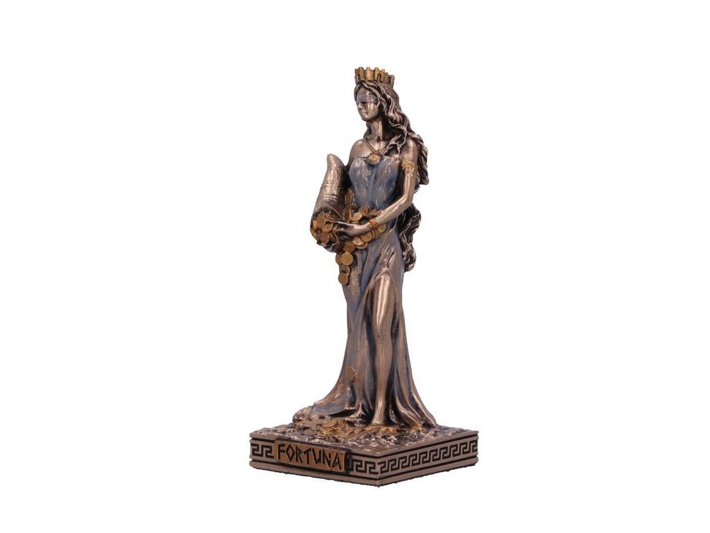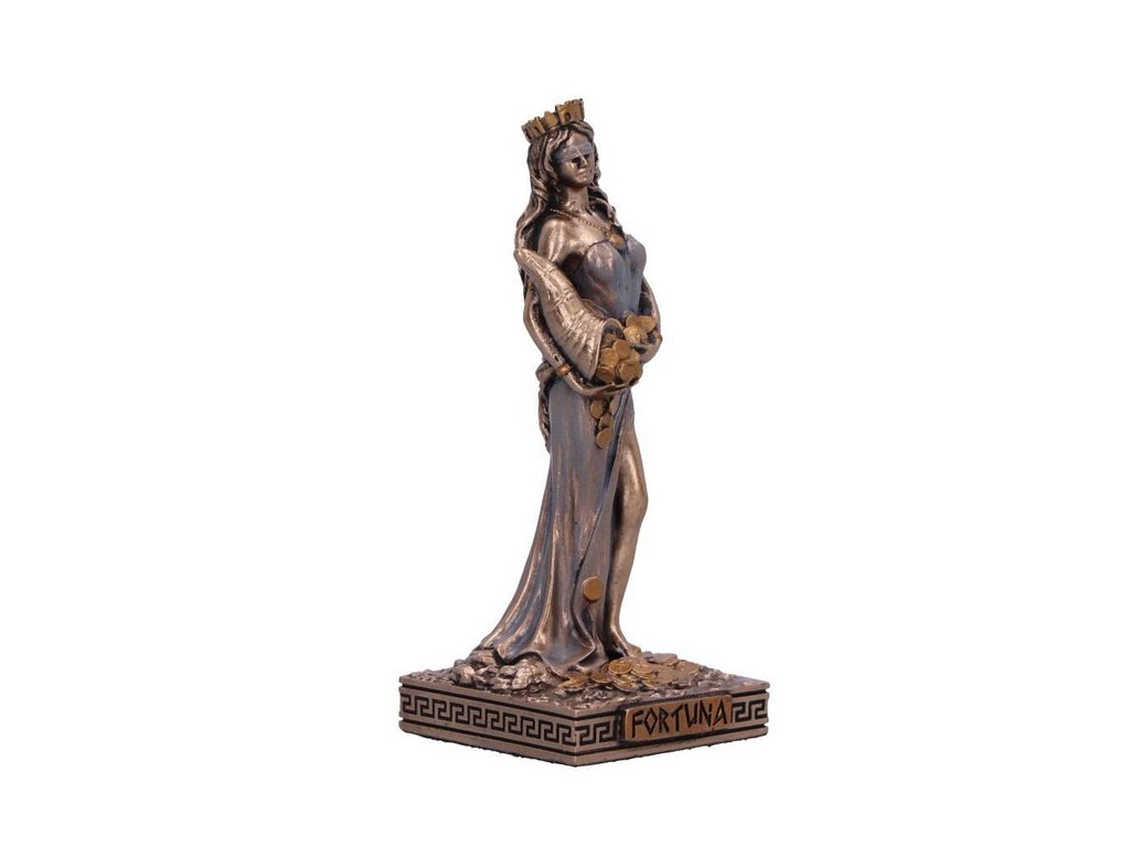 Přijměte rozmary osudu s figurkou Fortuny, bohyně štěstí a náhody. Vyvedena v pečlivých detailech, Fortuna stojí s grácií, oděná v elegantní róbě a koruně, která zachycuje její božsky náhodnou přítomnost. V rukou třímá roh hojnosti, překypující symboly dostatku a prosperity, který zosobňuje benevolenci, s jakou Fortuna obdarovává šťastlivce svou přízní.