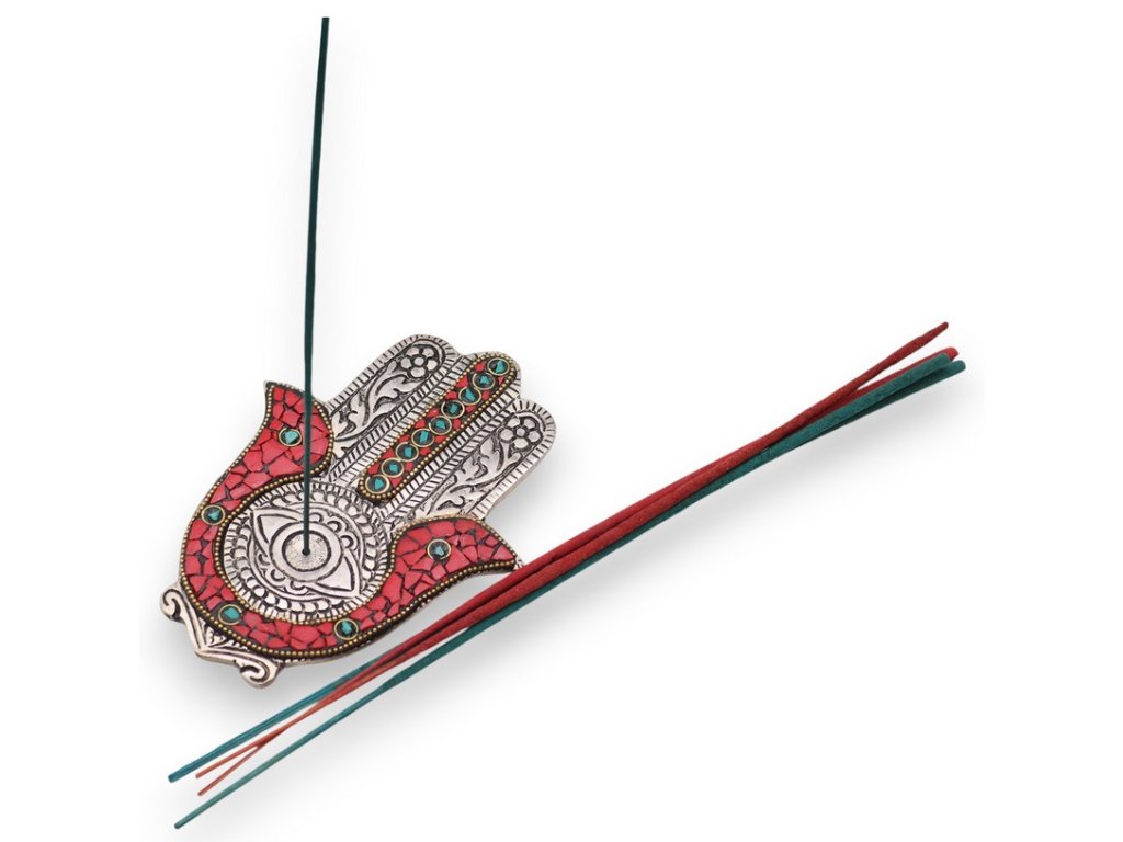 Dvoubarevný design se vyznačuje nápadným červeným a zeleným povrchem, který krásně doplňuje symbol Hamsa, známý svými ochrannými vlastnostmi. Tento stojánek slouží jako funkční doplněk, ale i jako dekorativní kousek, takže je skvělým doplňkem do domácností i meditačních prostor.