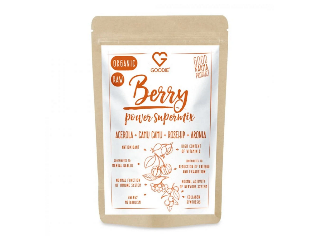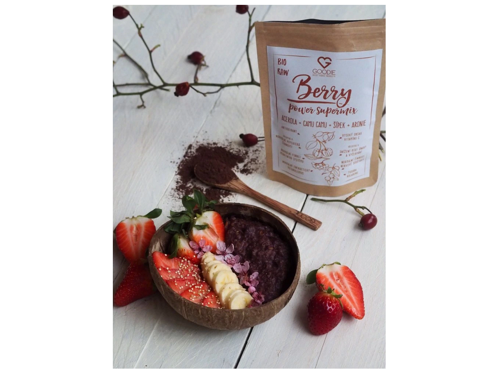 Berry Power Supermix představuje výjimečnou směs čtyř superpotravin - šípku, camu camu, aceroly a aronie. Tyto plody jsou přirozeně bohaté na vitamin C a další rostlinné látky, které jsou běžnou součástí pestré stravy. Díky tomu je nejen zpestřením jídel po stránce chuťové, ale také jednoduchým způsobem, jak doplnit jídelníček o vitamin C, který přispívá k normální funkci imunitního systému.