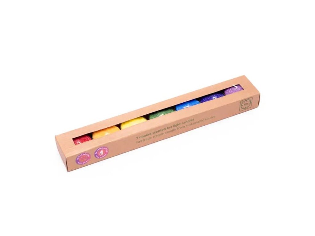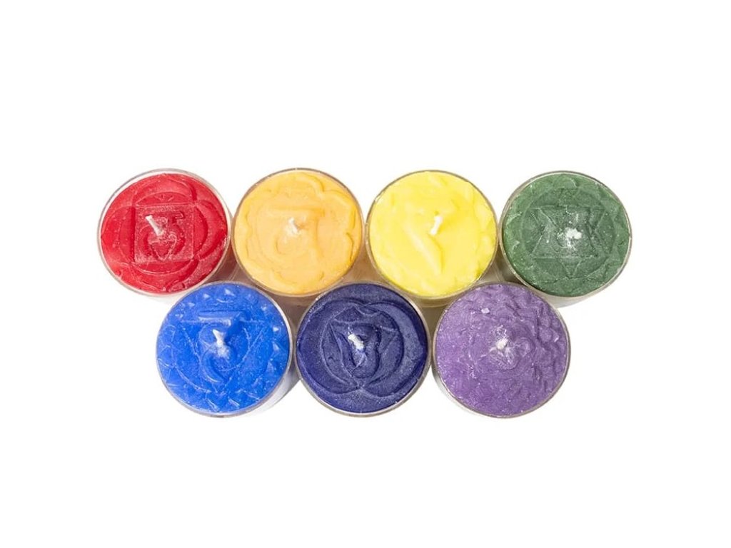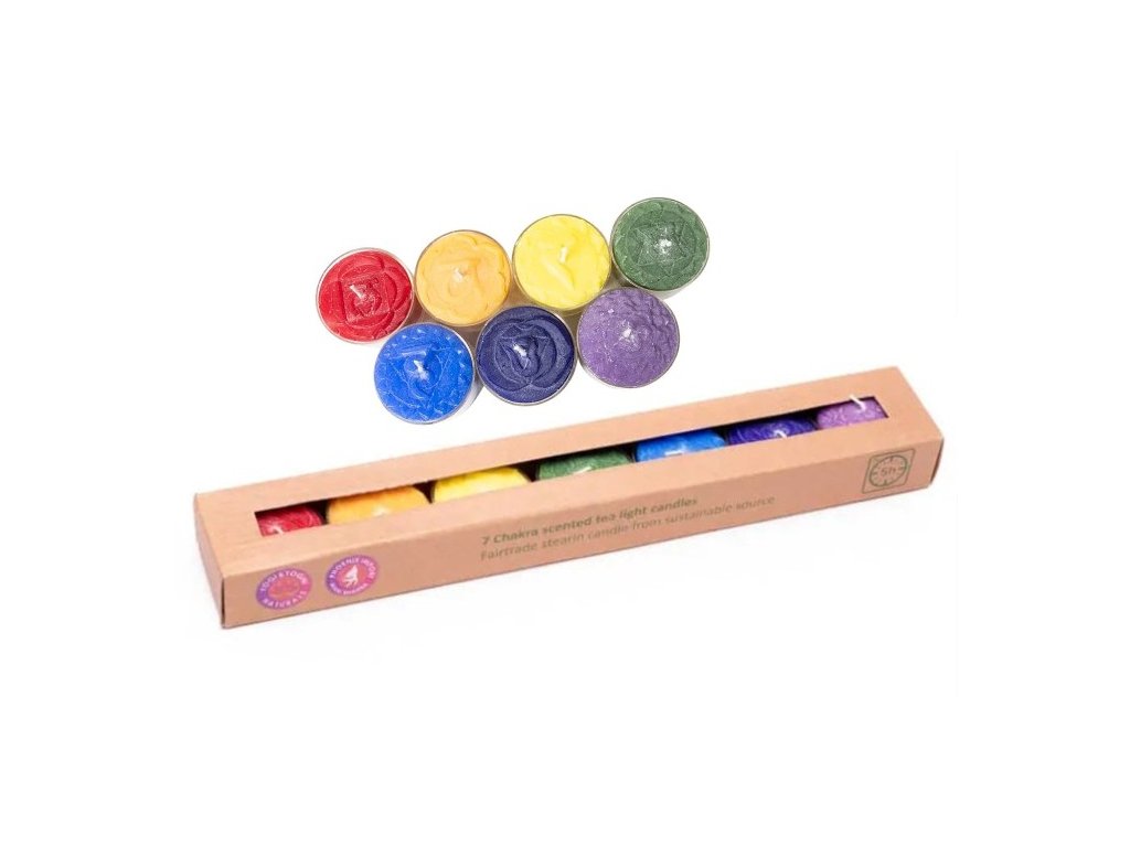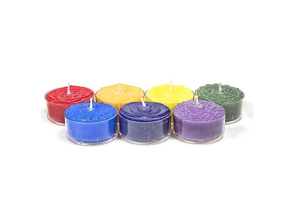 Sada čajových svíček ve skle. Každá svíčka má reliéf čakry a obsahuje specifické esenciální oleje.