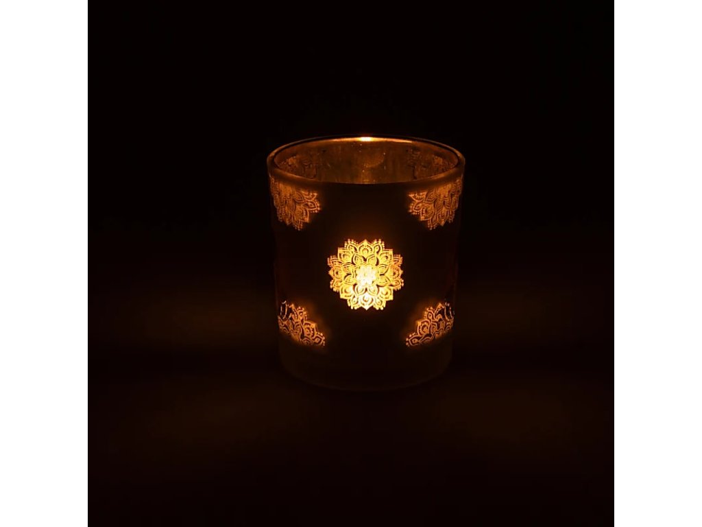 Skleněný svícen s kovovou vrstvou. Je zdoben motivem sedícího buddhy, který po zapálení svíčky mizí a nechává prosvítat doprovodné mandalové motivy navozující mystickou atmosféru.
