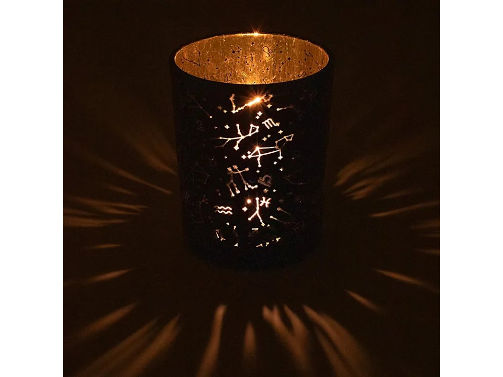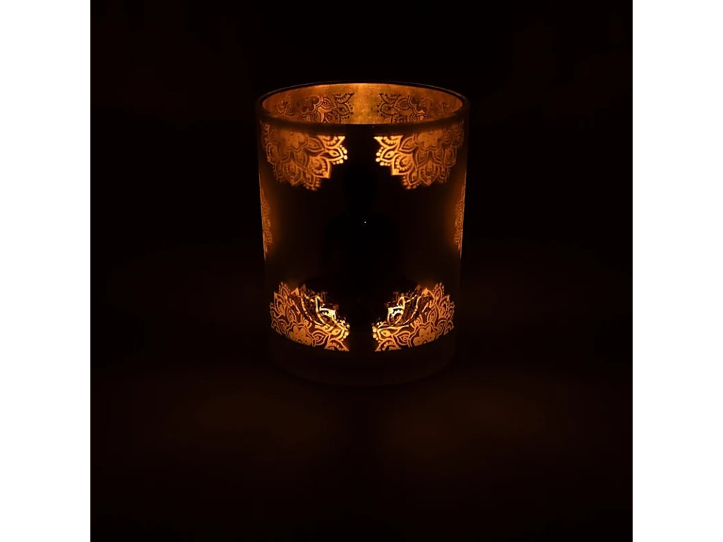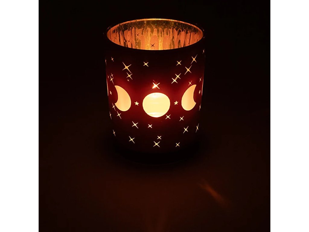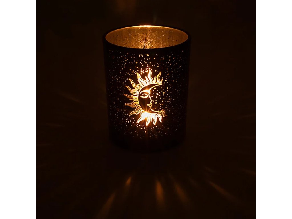 Skleněný svícen s kovovou vrstvou. Je zdoben mystickými symboly, které po zapálení svíčky ve tmě buď ustupují do pozadí a nechávají vyniknout do té doby skryté průsvitné doprovodné motivy, nebo prosvítají společně s nimi.