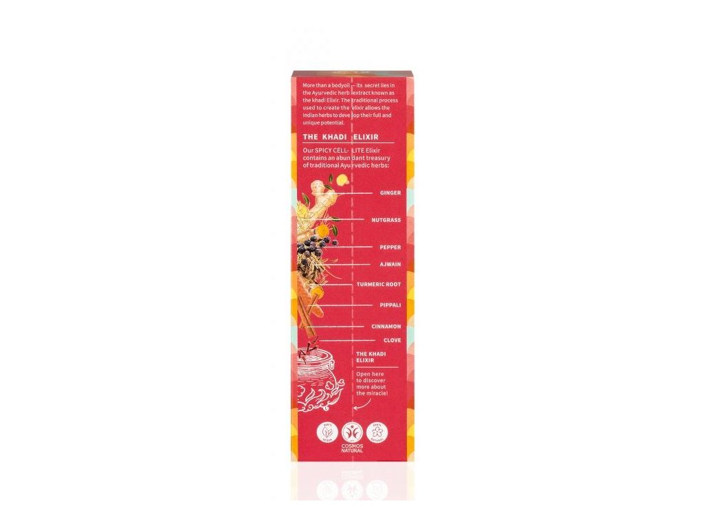 Tajemství působení proti celulitidě spočívá v Khadi elixíru Spicy Cell-lite: ručně sbírané indické rostliny jsou pomocí tradičních, časově náročných ajurvédských procesů citlivě ohřívaný v kotlích nad otevřeným ohněm. Získané extrakty jsou v rámci ajurvédské receptury propojeny do mocného celku - Khadi elixíru, doplněného zároveň oleji éterickými. Díky tomuto synergickému komplexu jsou účinky jednotlivých rostlin maximalizovány. Pomocí speciálních ajurvédských postupů jsou poté rostlinné extrakty zapracovány do kompozice cenných pečujících olejů, aby celé toto rostlinné bohatství dalo společně vznik vysoce účinnému elixír oleji pro pokožku a duši.
