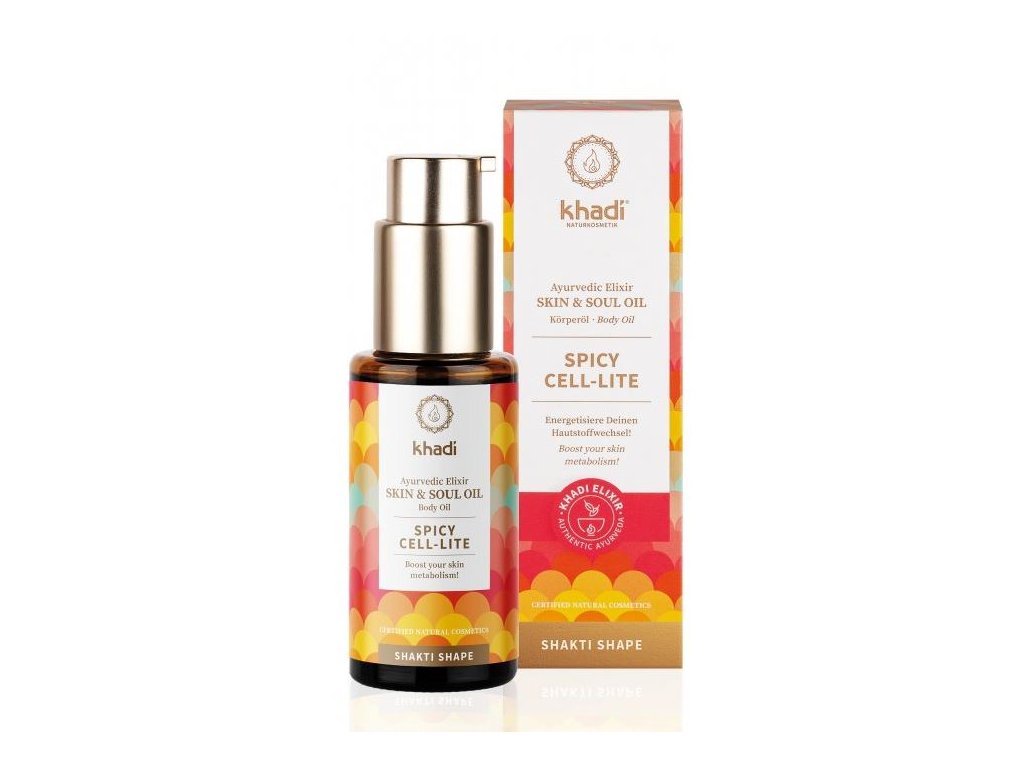 Khadi elixír olej Spicy Cell-lite: osvobozující oheň, který prostoupí problémové partie Vaší pokožky. Khadi elixír olej Spicy Cell-lite „nakopává“ látkovou výměnu v pokožce a uvolňuje odpadní metabolity nastřádané v tukových polštářcích.