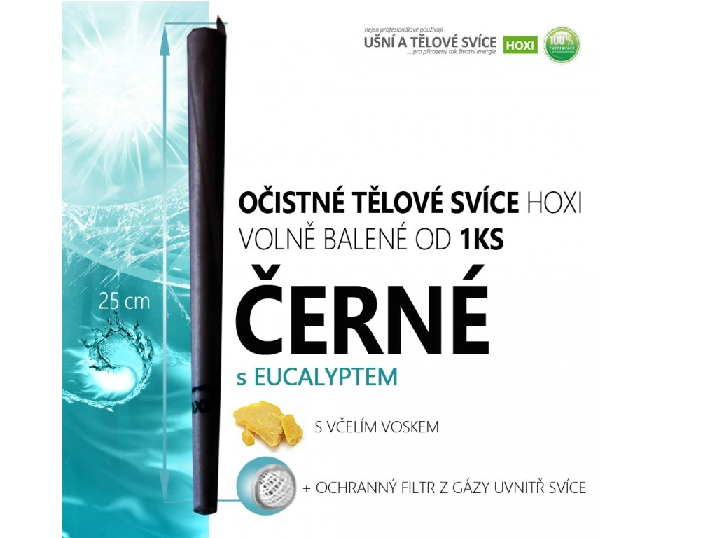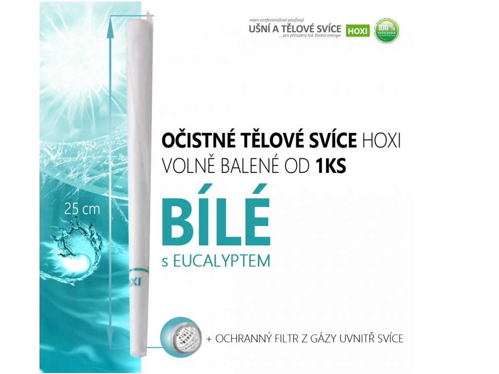 Očistné tělové svíce HOXI v novém desingu. Nyní jsou všechny svíčky v kónickém tvaru s optimalizovanou délkou pro ještě lepší a účinnější efekt! Svíce HOXI jsou vyráběny výhradně ručně. Svíce HOXI neobsahují žádné filtry z těžkých kovů, přidaný hliník apod. Očistné tělové svíce HOXI jsou opatřeny ochranným filtrem z gázy uvnitř svíce.
