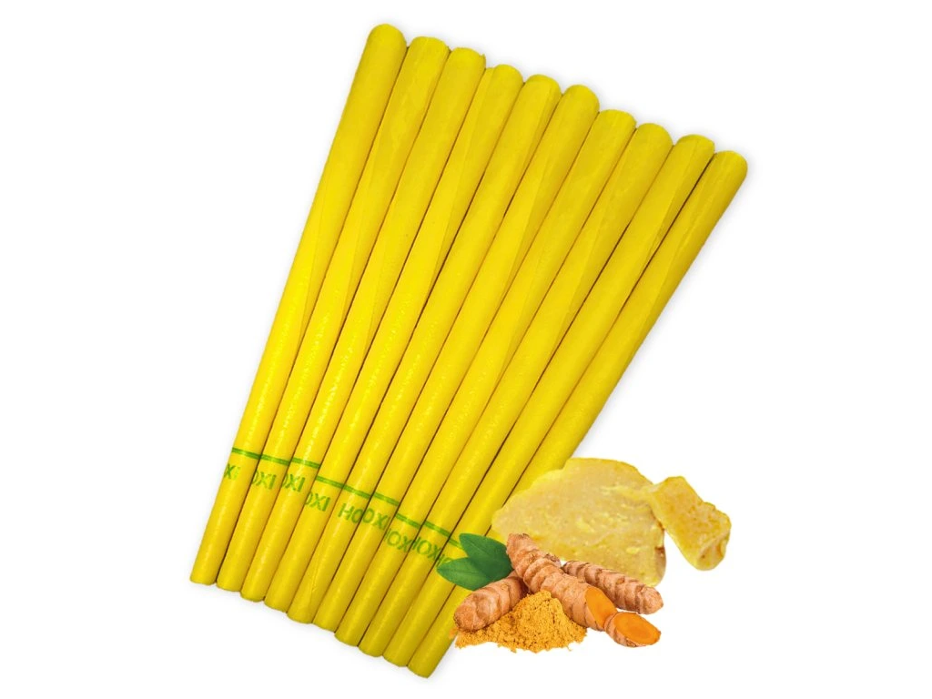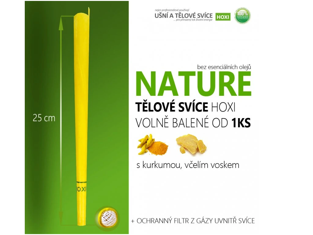 Volně balené tělové svíce HOXI NATURE jsou vyrobeny ručně ze 100% bavlněného plátna, včelího vosku a protizánětlivé kurkumy. Tělové svíce HOXI jsou kónického tvaru s optimalizovanou délkou pro co nejlepší účinnost. Každá tělová svíce HOXI je opatřena ochranným filtrem z gázy. Neobsahuje žádné esenciální oleje.