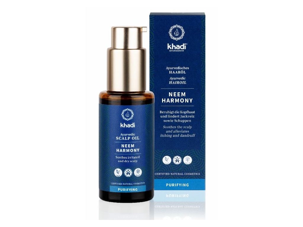 Intenzivní péče před mytím vlasů: Khadi ajurvédský olej Neem Harmonie pro vlasovou pokožku – pro zklidněnou, harmonickou vlasovou pokožku bez lupů, šupinatění a svědění.
