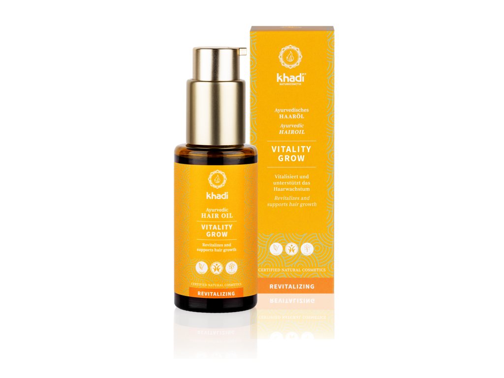 Intenzivní péče před mytím vlasů: Khadi ajurvédský olej Vitalita Růst pro vlasy a vlasovou pokožku – znatelně více vitality, vyživená vlasová pokožka a kořínky a vysněný růst vlasů.